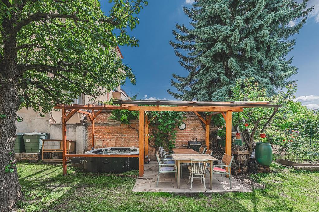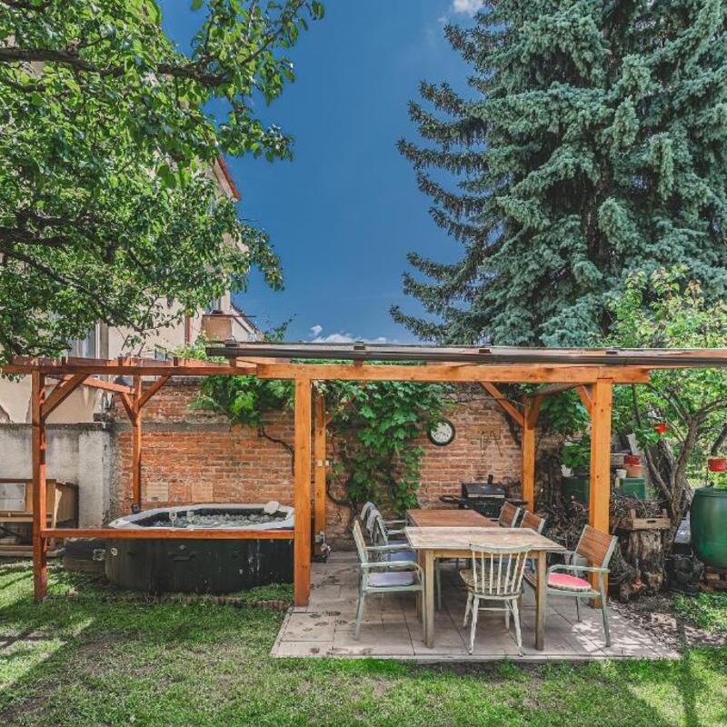 Na zahradě je k dispozici pergola s grilem na dřevěné uhlí. Od ní je do vířivky jen krok.