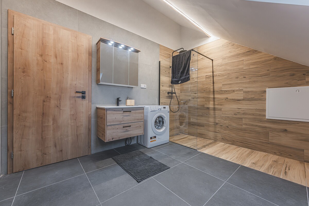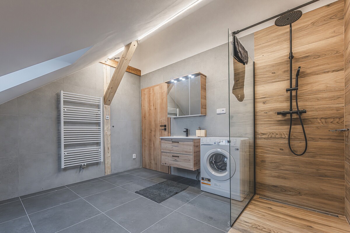 Moderní kuchyň je vybavená vším potřebným pro běžné vaření.Koupelna je vybavena pračkou se sušičkou, prací gel je samozřejmě k dispozici.